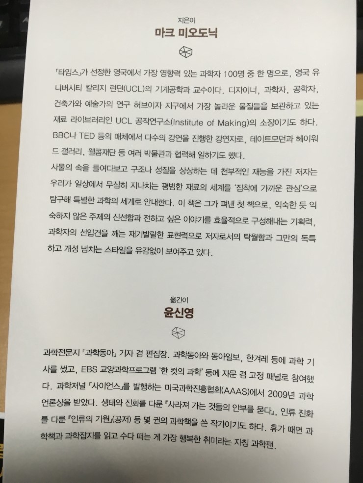 마크 미오도닉, 일단 저자 소개에서도 이야기가 나온다 '집착에 가까운 관심'. 우리 생활에 과학이 녹아있다 녹아있다 말을 하지만, 사실 제대로 다가오게 하는 데는 이런 책 만한 게 없다고 느끼는데 특히 이 책은 과학적 시각이 재미있어서, 그런 과학자라서 사물들에 접근해서 그 세세함을 구분해 낸 것 같아서 더욱 의미가 깊다. 나도 과학덕후로서 상당히 존경할 만한 부분이기도 하다. '집요함'이란게 사실 에너지가 많이 들어가서 그런지 쉽지가 않은 부분이니까.