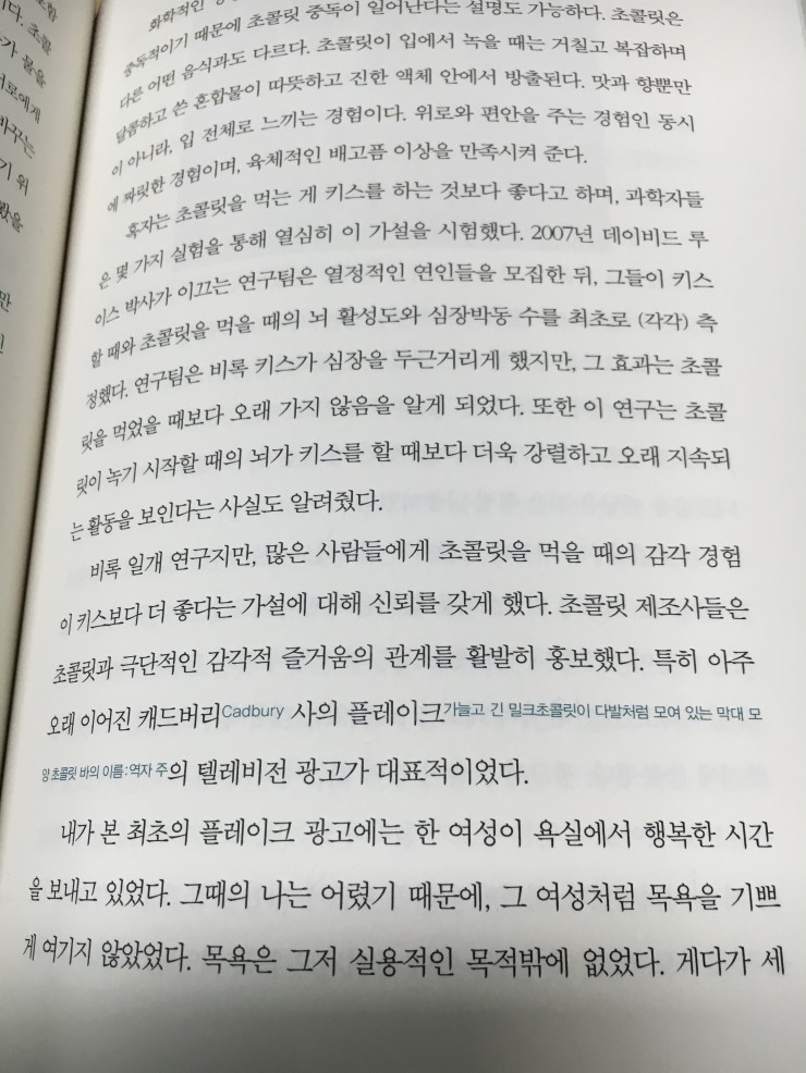 초콜릿 부분에서 재미있었던 부분이라 발췌해 본다. 나도 궁금한 게 있으면 직접 논문을 찾아보는 편인데, 그래도 이 작가님의 집요함을 따라갈 수가 없다. 특히 키스와 초콜릿의 관계가 논문으로도 있을 줄은 몰랐다. 이 책은 이런 식으로 다양한 자료가 작가 본인의 경험 혹은 생각의 흐름과 함께 전해지면서 독자에게 다가온다.