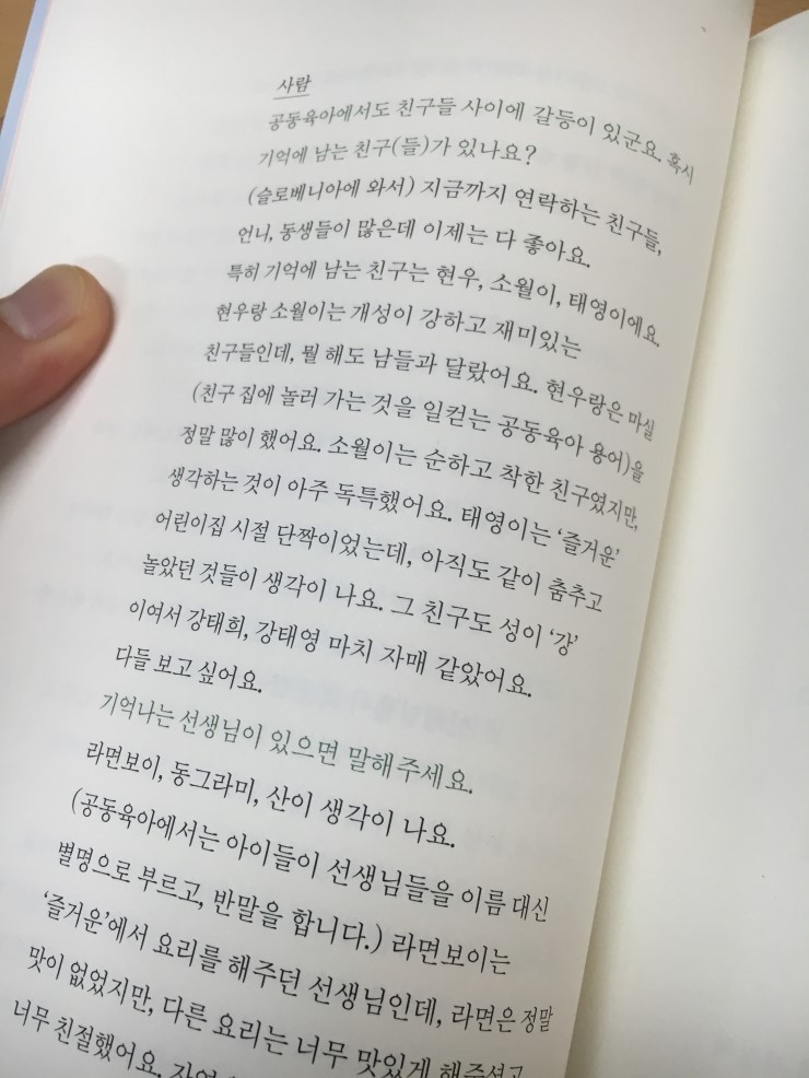 딸이 직접 이야기하는 것을 적어두어 공동육아에 대해 아이의 시선을 이야기 해준다. 익숙치 않은 육아형태이다 보니 이 책에서 사실 처음 접한 점들이 많았는데, 인간은 사회적 동물인 만큼 이 방식이 나쁘게 다가오지 않았다.