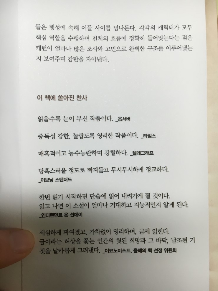 최연소 맨부커상, 이번에 저자소개를 다 읽은 후 봤는데, 왜 뉴질랜드를 배경으로 그렸을까 했던게 이 분이 현재 '거주하고'있는, 그래서 조사가 더철저했구나 싶은 생각이 든다.