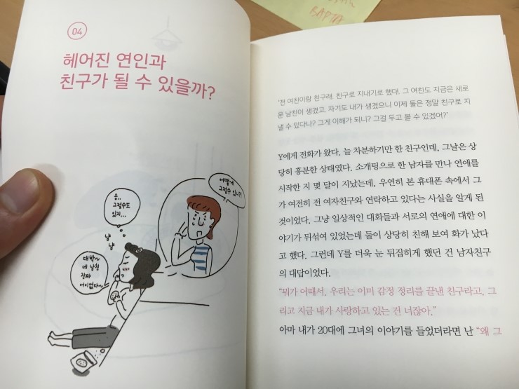 그렇다, 다른 이들과의 의견교환은 전혀 둘 사이 문제에 '정보'도 되지 않는 다는게 내 생각인데 그러한 이야기가 진행되는 챕터가 있어서 신선했다.