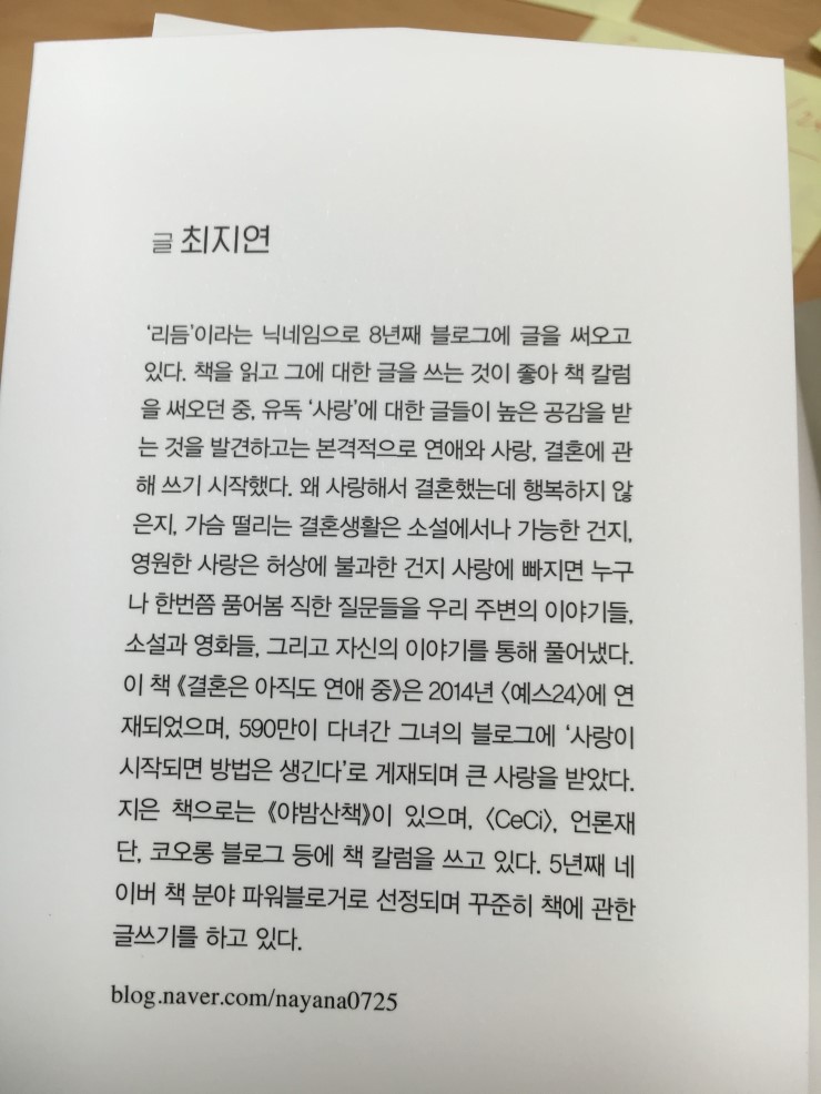 이런 에세이 책인 만큼, 저자 분의 약력이, 약력이라기보단 살아온 인생길의 느낌과 뉘앙스가 중요한데, 일단 파워블로거 이시고 특히 사랑, 결혼에 대한 이야기들을 푸는 이야기로 사랑 받는 분인 듯 하다. 사실 이 책을 알기 전에 접해보지 못한 분이지만, 저기 주소로 들어가 보니 네이버 블로그가 아주 번창한 분이란 걸 알 수 있었다.