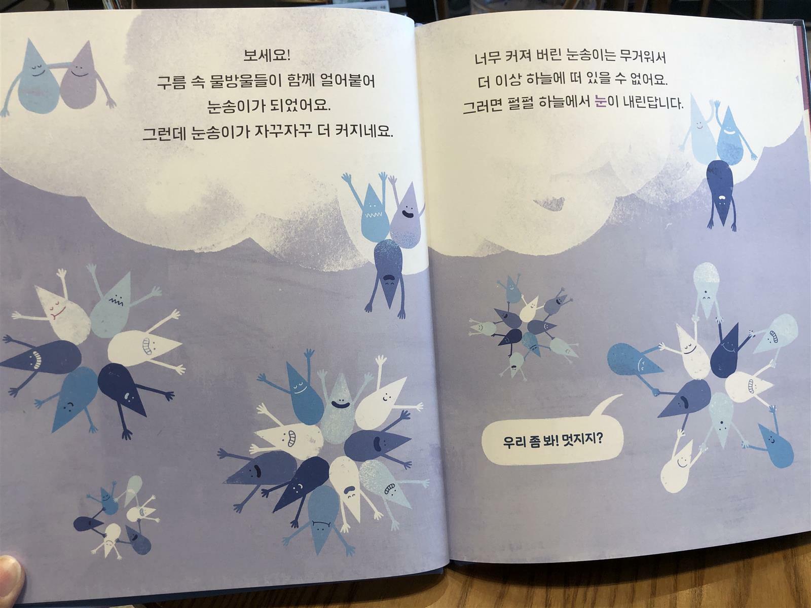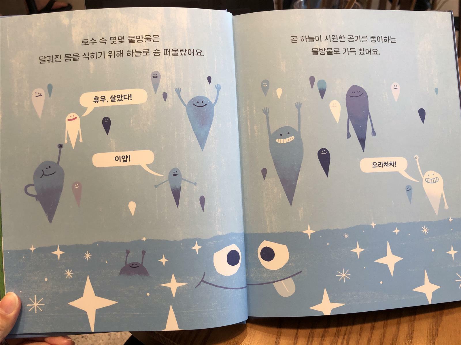증발, 응결 등 어려운 과학 용어는 나오지 않고 물방울들이 몸을 식히기 위해 하늘로 올라갔다고 설명해요.