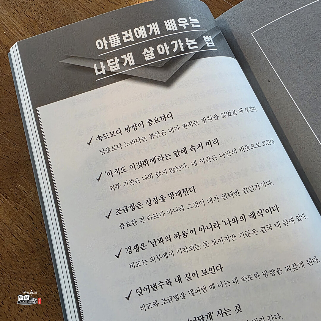 고전의 언어를 현대의 감각으로 풀어내는 민유하 작가와 제이한 작가는 아들러의 방대한 이론 중에서도 현대인이 가장 취약한 비교와 열등감이라는 키워드를 파고듭니다. 마케팅 업계에서 트렌드를 분석해온 제이한 작가의 시각이 더해져, 심리학 이론서의 딱딱함을 벗어 흥미롭게 읽을 수 있었습니다.
