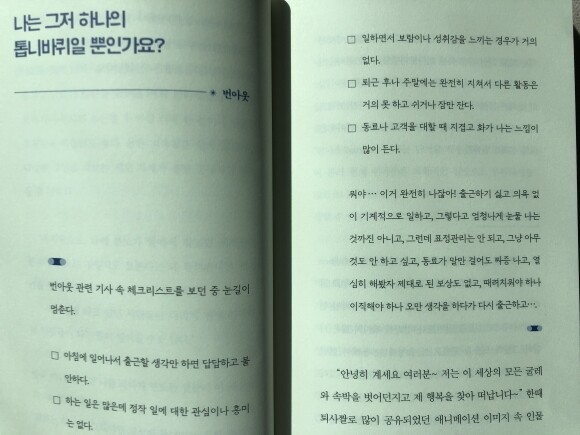 삶이 무력해질 시기, 인생을 되돌아볼 중요한 시기, 사는 재미가 없어지고 돈 벌기 급급해지진 않았나, 주변 환경이 스트레스를 주는 상황에 계속적으로 놓여 있지는 않나, 변한 게 없는 똑같은 삶을 살고, 특별한 목표 없이 하루를 살고 있지는 않은지, 행복이란 단어와는 거리가 먼 인생을 살고 있지는 않은지 고민하게 된다.