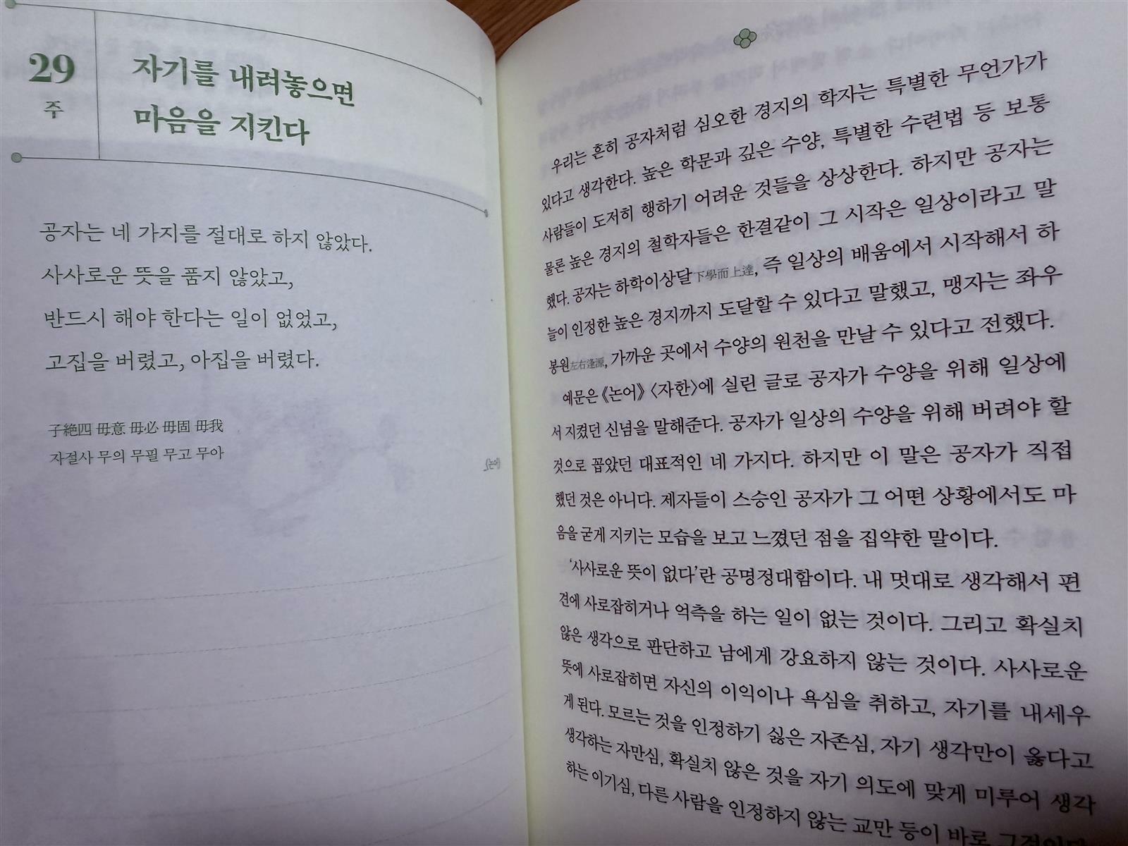 시대가 혼란스럽고 삶이 버거워질 때마다 자신보다 나이가 많은 선배나 어르신을 보게된다. 어떻게 자신만의 어른다움을 쌓아나가며 세월을 보냈을까? 궁금해진다. 어른의 그릇은 자신 안의 어른다움, 마음 그릇의 정수를 담아내야 한다. 생각과 말, 행동, 감정, 태도를 함양하는 것으로 선조들의 얼이 담긴 고전에서 마음을 다루는 공부를 찾을 수 있다. 천년의 고전에서 알수 있는 지혜로운 마음의 정수라고 이야기를 한다. 자신을 바르게 하는 선한 마음을 품으며, 오래된 묵은 감정은 씻어내어 새로운 뜻을 세우며, 세상을 담을 만큼 넉넉한 성품을 기르기까지 여정을 통해 자신만의 삶의 격이 달라짐을 느껴보자.