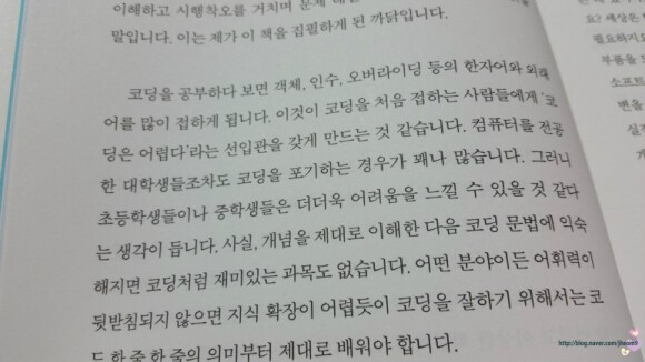 코딩 언어가 한자어와 외래어를 많이 적어놓아서 '코딩은 어렵다' 라는 선입관을 갖게 만든다고 적혀 있어요.