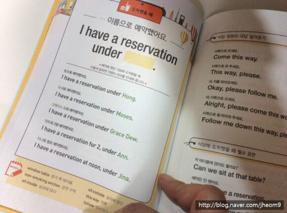 식당에 도착했을때부터 음식 주문,식당에서 꼭 필요한 대화 나누기 등이 적혀
