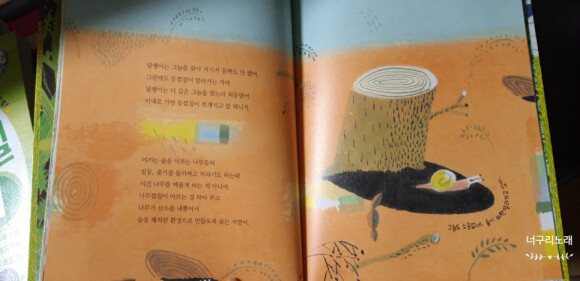 그래서 그림처럼 살아남은 이끼는 달팽이 등껍질에 타고 다시 죽은 숲으로 돌아간다는 이야기랍니다.