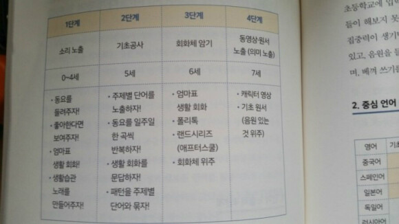 책에서는 엄마표 홈스쿨로 아이 교재를 같이 공부하며 그 언어가 언제까지 유효한지 알려