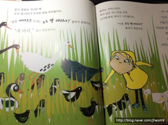 롤라와 찰리는 가게가다가 보이는 오리, 비둘기, 백조 등의 수를