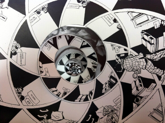 책 상태는 두깨가 5cm이다. 1.5kg이 넘는 무게로 절대로 들고 다니면서 볼 수 있는 사이즈는 아니다. 책상용 또는 침실용으로 적합하다. 연이어 두꺼운 만화책을 읽고 있어서 그런지 딱히 놀랍지도 않다. 책은 두께에 비해서 빨리 읽힌다. 하지만, 좀 힘들다. 만화라면 흔히 생각하게 되는 알록달록하고 가벼운 그림과는 거리가 멀고 검은 색으로 농담으로만 표현한 그림은 거칠다. 외국 작가가 현대 수묵화 기법을 자유자제로 표현한다며 내 맘대로 생각해 봤다. 이여운 작가의 우중고적 전시도 생각나고 얼마 전 시립미술관에서 했던 이미지 수사학 전시의 유근택 작가의 <어떤 만찬>이 기억나기도 했다. 하지만 이 만화는 그 작품들보다 훨씬 거칠고 쓸쓸하다. 화면에 비슷하면서도 다른 인물들이 등장하고 그 인물들은 사연을 끌어 안고 나타나, 이야기를 불친절하게 풀어 놓는다. '사실은 이야기 하려고 이야기 한거 아니거든'이라고 말하는 듯 하다.