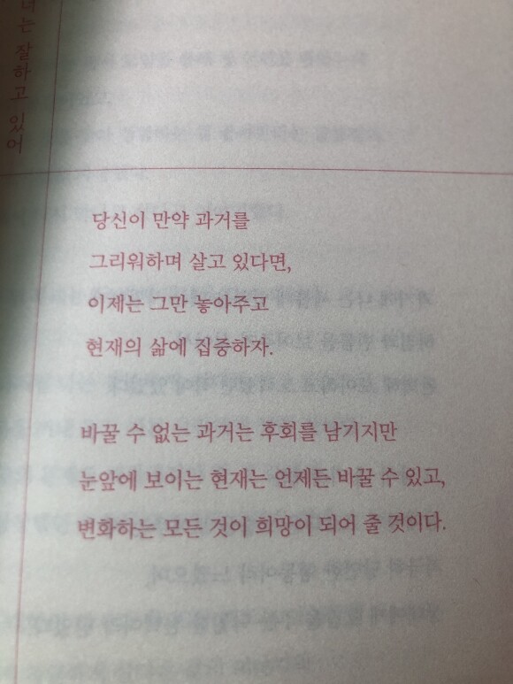 -바꿀 수 없는 과거는 후회를 남기지만 눈앞에 보이는 현재는 언제든 바꿀 수 있고, 변화하는 모든 것이 희망이 되어 줄 것이다.