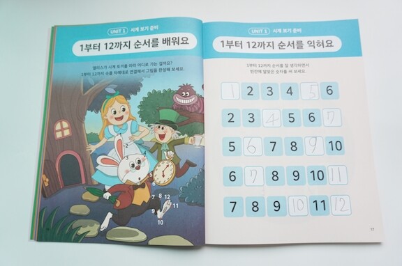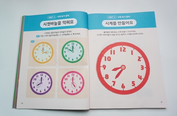 책의 내용은 1시부터 12시까지 그리고 몇 시 30분 배우기