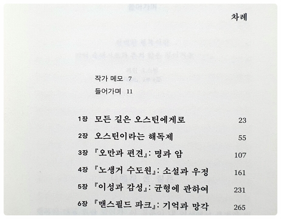 저자께서는 제인오스틴의 작품 <애마> 2부 9장의 대목을 보여주시면서 '들어가며' 글을 시작하셨고 무려 12쪽에 달하는 긴 머리글을 남기셨다.
