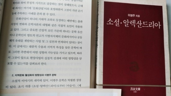향토문학을 설명하면서는 이병주 작가의 책을 언급했는데 낯익은 제목을 읽다보니 발견했다. 얼른 책꽂이에 가서 살핀다. 역시나 있다. 범우문고에서 나온 [소설* 알렉산드리아]다. 1989년 2판 2쇄가 발행된 작품으로 책챗의 뒷면에 1,000원이라는 가격표기 반갑기 그지없다. 163페이지의 손바닥만한 문고본의 가격이 이정도 . 시대가 다르긴 하지만 책값의 변화를 엿볼 수 있다.