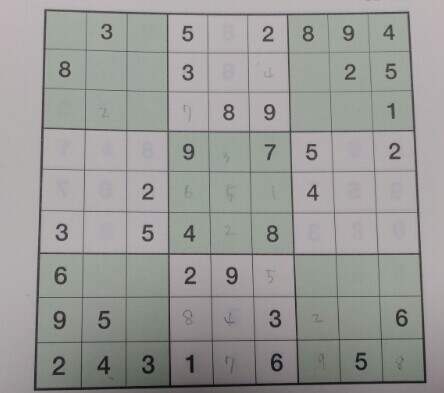 이 책에서는 총 180개의 문제를 고급과 최상급으로 나누어서 구성해 놓고 있다. 내가 선택한 문제는 고급의 마지막 번호인 90번 문제였다. 워낙 많은 스도쿠 책들을 가지고 있고 풀기도 많이 했던 터라 자신 있게 시작했었는데 어라, 예상이 빗나갔다. 단 두개의 숫자를 쓰고 난 이후 머리가 명한 상태에 접어들었다.