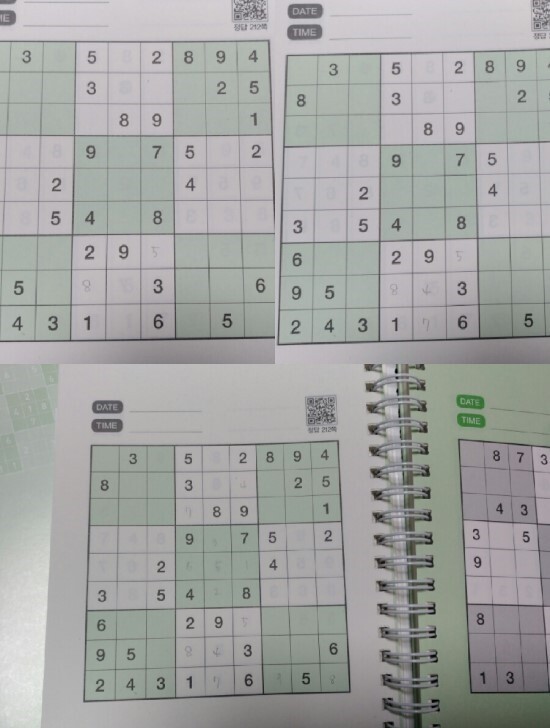 눈이 부시도록 하얀 종이가 아니어서 오래 보고 있어도 눈이 아프지 않다. 연필로 숫자를 적는 사각사각 소리가 정답다. 스도쿠는 그야말로 행복을 주는 책이다. 비록 많이 어렵더라도 도전감을 남겨주니 그마저도 즐겁다.