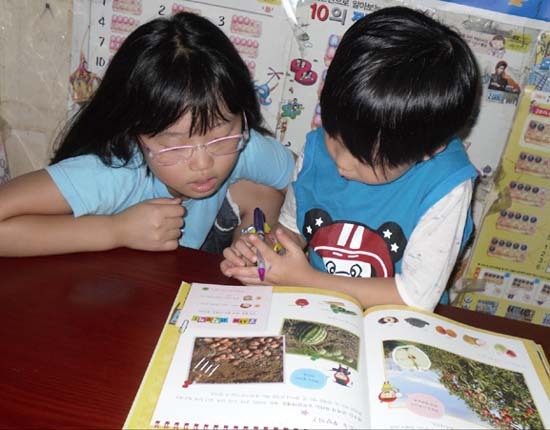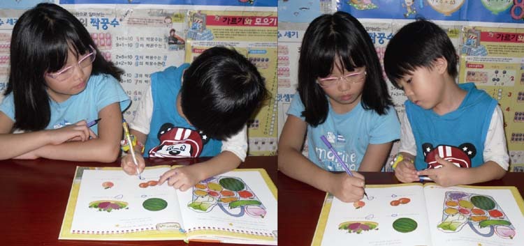 누나는 과일을 찾고 민서는 채소를 찾아 동그라미를 해보았어요