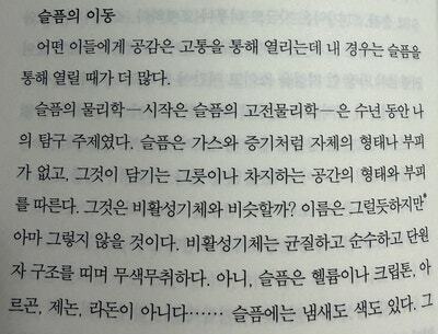 그리고 슬픔이 “그것이 담기는 그릇이나 차지하는 공간의 형태와 부피를 따른다.”고 말한다.