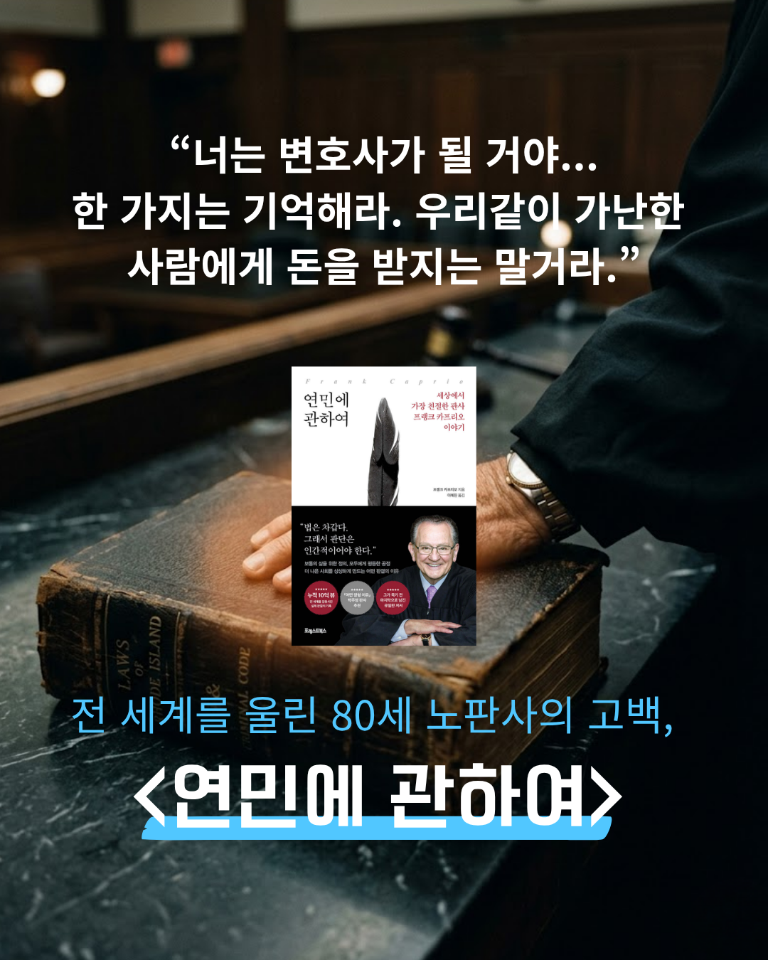 솔직히 말하자면, 책 후반부에 나열된 판결 사례들은 비슷한 판결들의 반복이 살짝 루즈한 면이 있다. 하지만 이 식상함이야말로 카프리오 판사가 평생에 걸쳐 지켜온 '태도의 일관성'이다. 그의 잔소리는 높은 곳에서 내려다보는 가르침이 아니라, 자신 역시 분노와 편견의 계절을 통과해온 선배가 건네는 가장 현실적인 사랑이자 지치지 않는 연민이다.