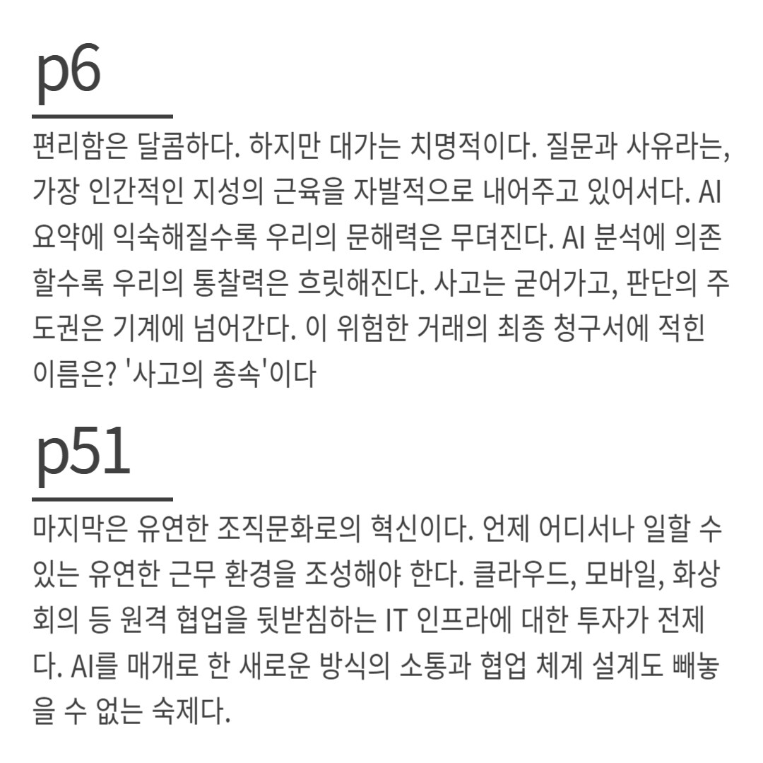 이 책은 묻고 있었다. 우리는 정말로 효율을 얻고 있는가, 아니면 생각하지 않아도 되는 상태에 길들여지고 있는가.