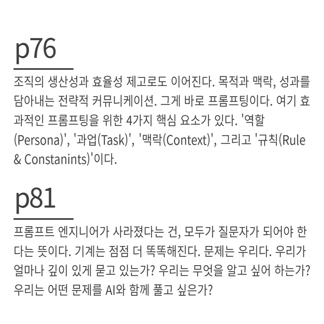 프롬프팅은 단순한 명령어 작성이 아니라, 목적과 맥락, 역할과 규칙을 설계하는 전략적 커뮤니케이션이었다. 프롬프트 엔지니어가 사라졌다는 말은 곧 모두가 질문자가 되어야 한다는 뜻이었다. AI는 질문의 질만큼만 작동한다. 얕은 질문에는 얕은 결과가 돌아온다. 깊은 질문은 문제의 정의 자체를 바꾼다.