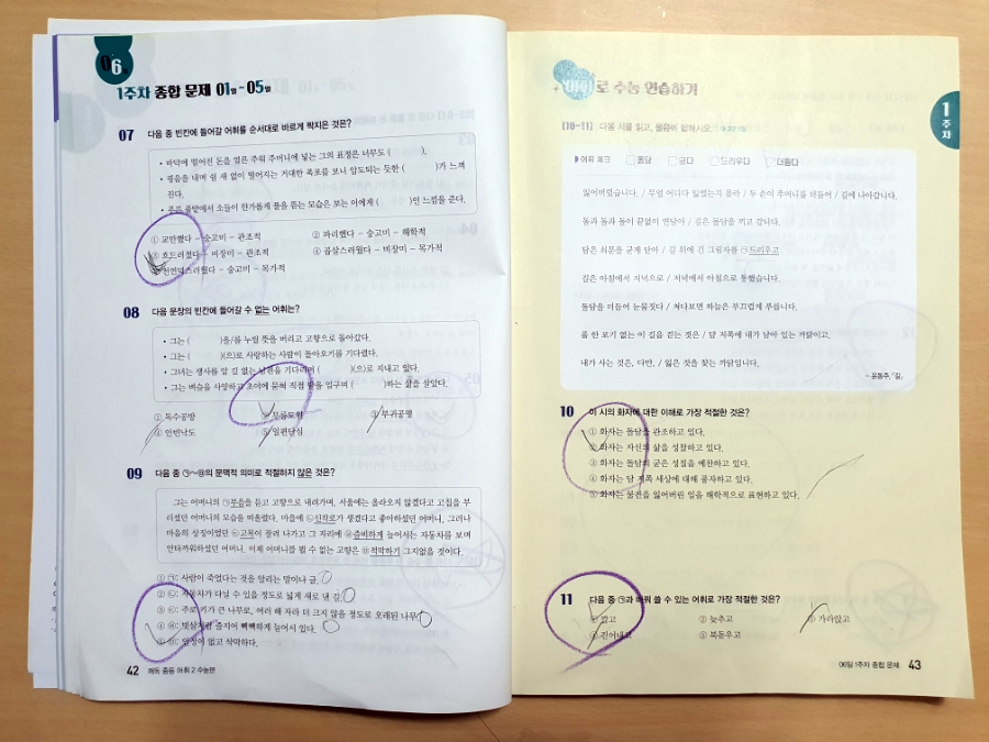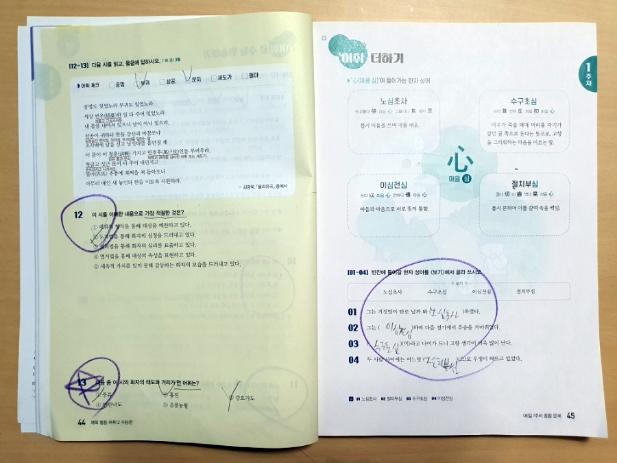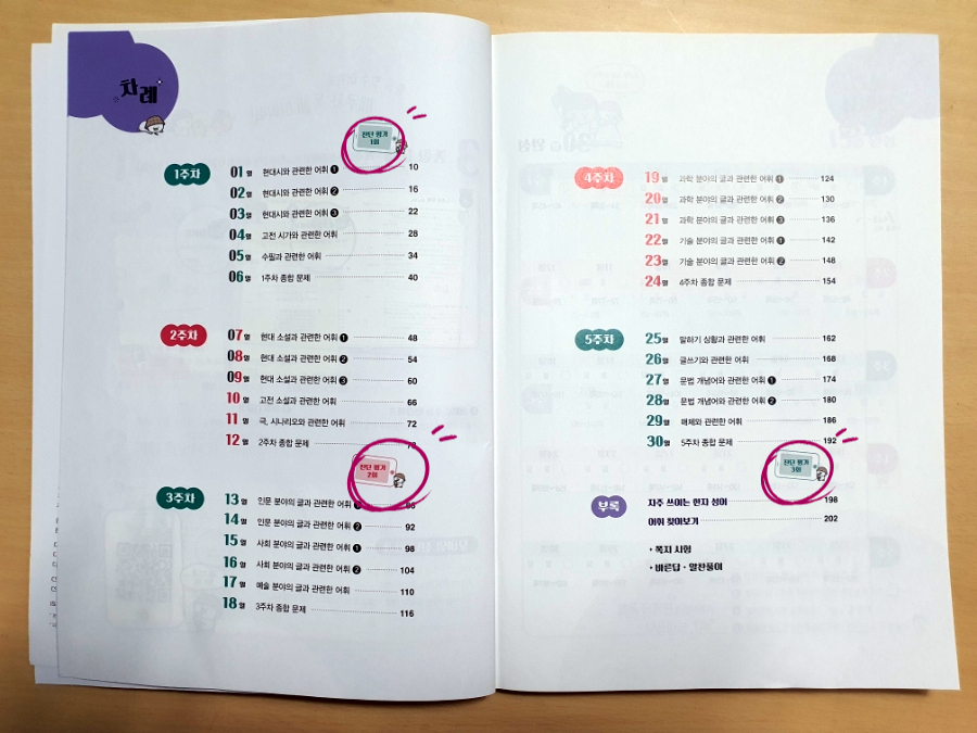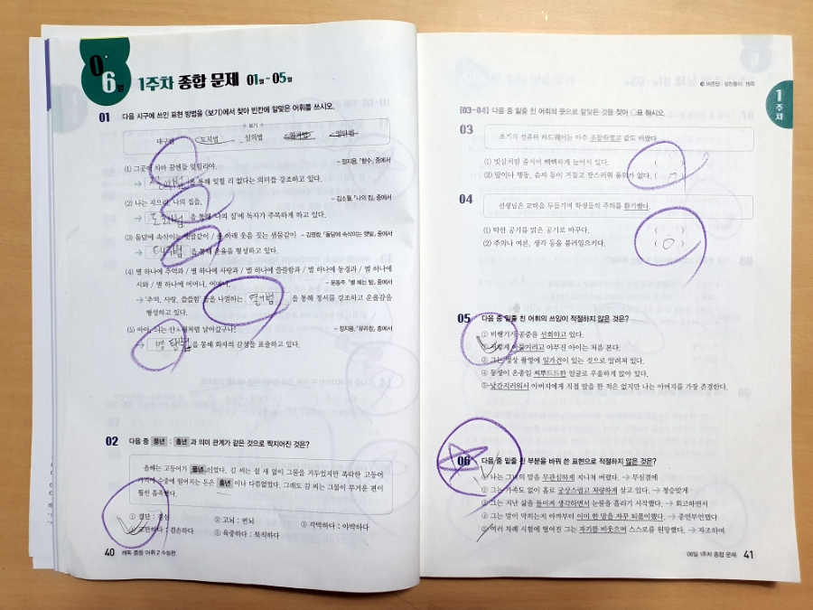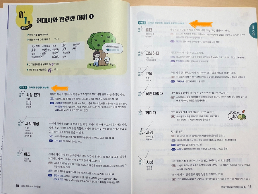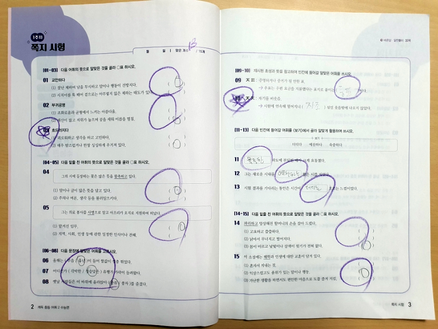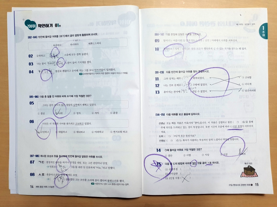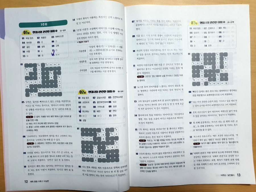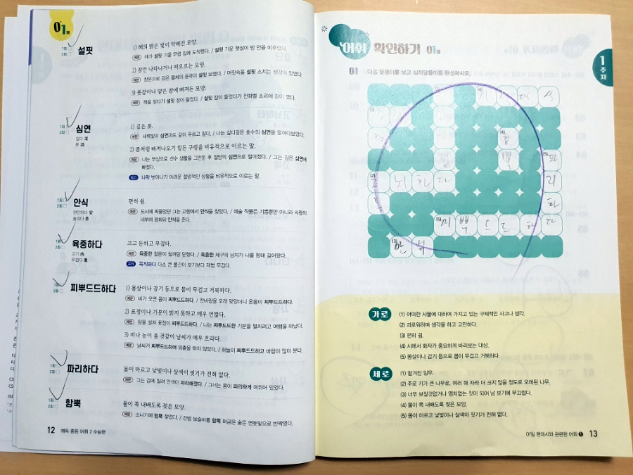 어휘 확인하기에선 십자말풀이로 연습하고 여러 가지 유형의 문제를 해결하며