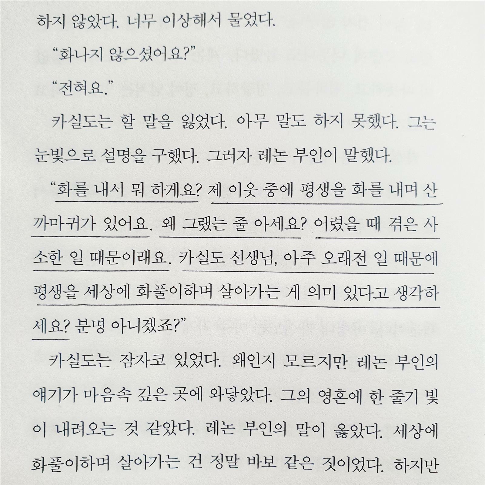 🔹️화를 내서 뭐 하게요? 제 이웃 중에 평생을 화를 내며 산 까마귀가 있어요. 왜 그랬는 줄 아세요? 어렸을 때 겪은 사소한 일 때문이래요. 카실도 선생님, 아주 오래전 일 때문에 평생을 세상에 화풀이하며 살아가는 게 의미 있다고 생각하세요?