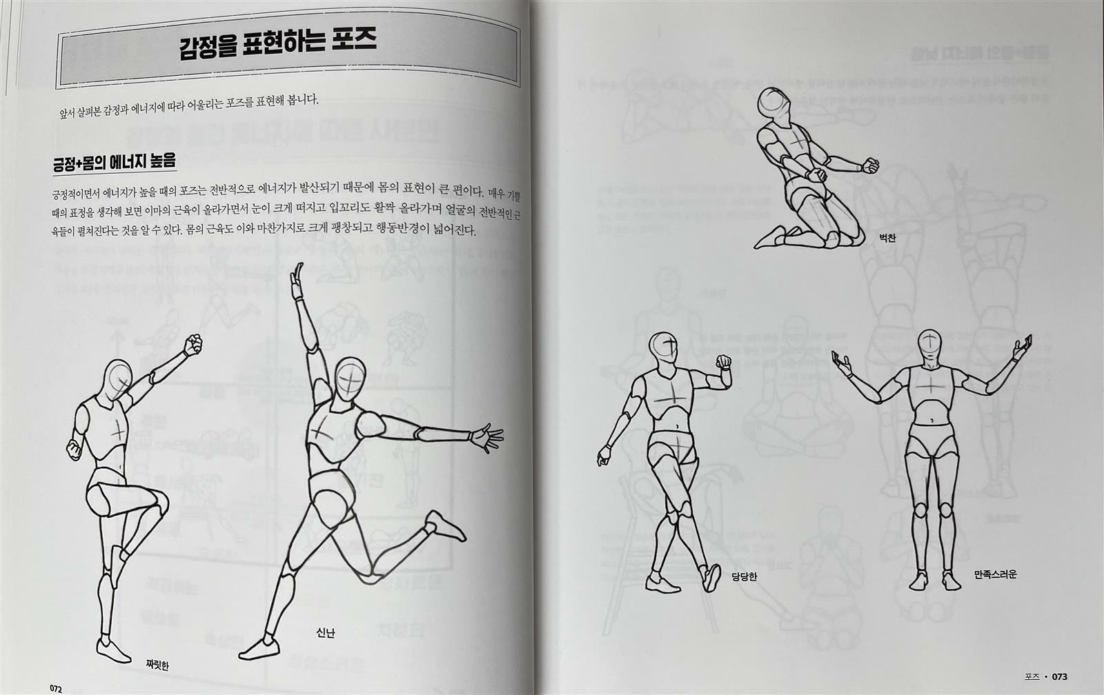 저는 감정에 따른 포즈는 일반적인 책에서 잘 볼 수 없는 부분인데 다양한 감정변화에 따라 구분을 해서 그려진 걸 보니 평소 감정과 포즈를 구별해서 본 적이 없어서인지 정말 다양함에 놀랐습니다.