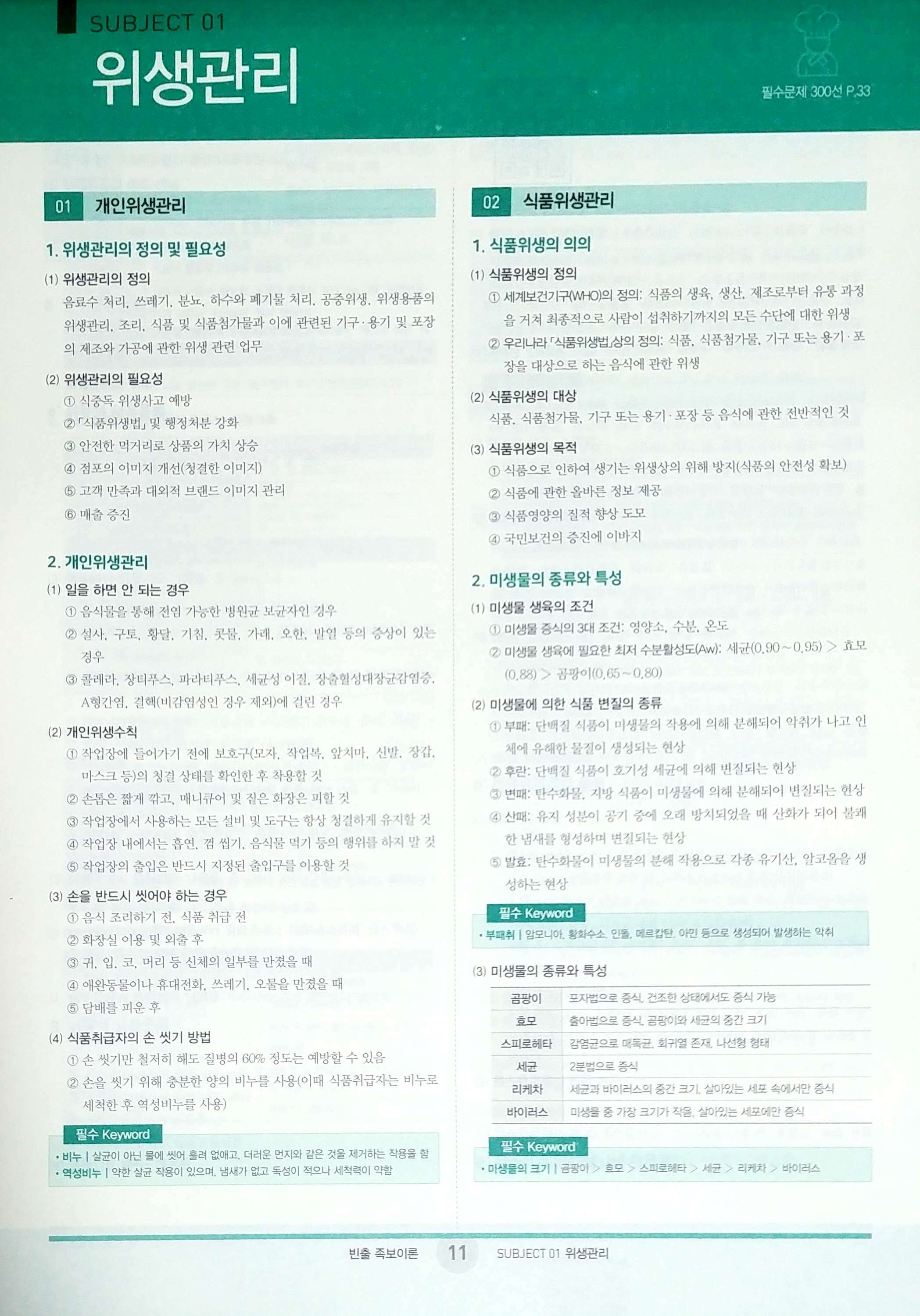 특히 위생관리, 식품위생관리, 미생물의 종류와 특성 등 세부 항목이 번호로 체계적으로 나뉘어 있어, 많은 내용을 한 번에 정리해서 보기 좋다. 이론에서는 각 단원마다 <필수 Keyword> 코너를 따로 강조해둔 점도 눈에 들어온다. 예를 들어 비누와 역성 비누의 차이, 미생물 크기 순서(곰팡이 > 효모 > 스피로헤타 > 세균 > 리케차 > 바이러스) 같은 내용이 눈에 띄게 정리되어 있다. 그래서 벼락치기 할 때도 꽤 도움이 될 것 같다.