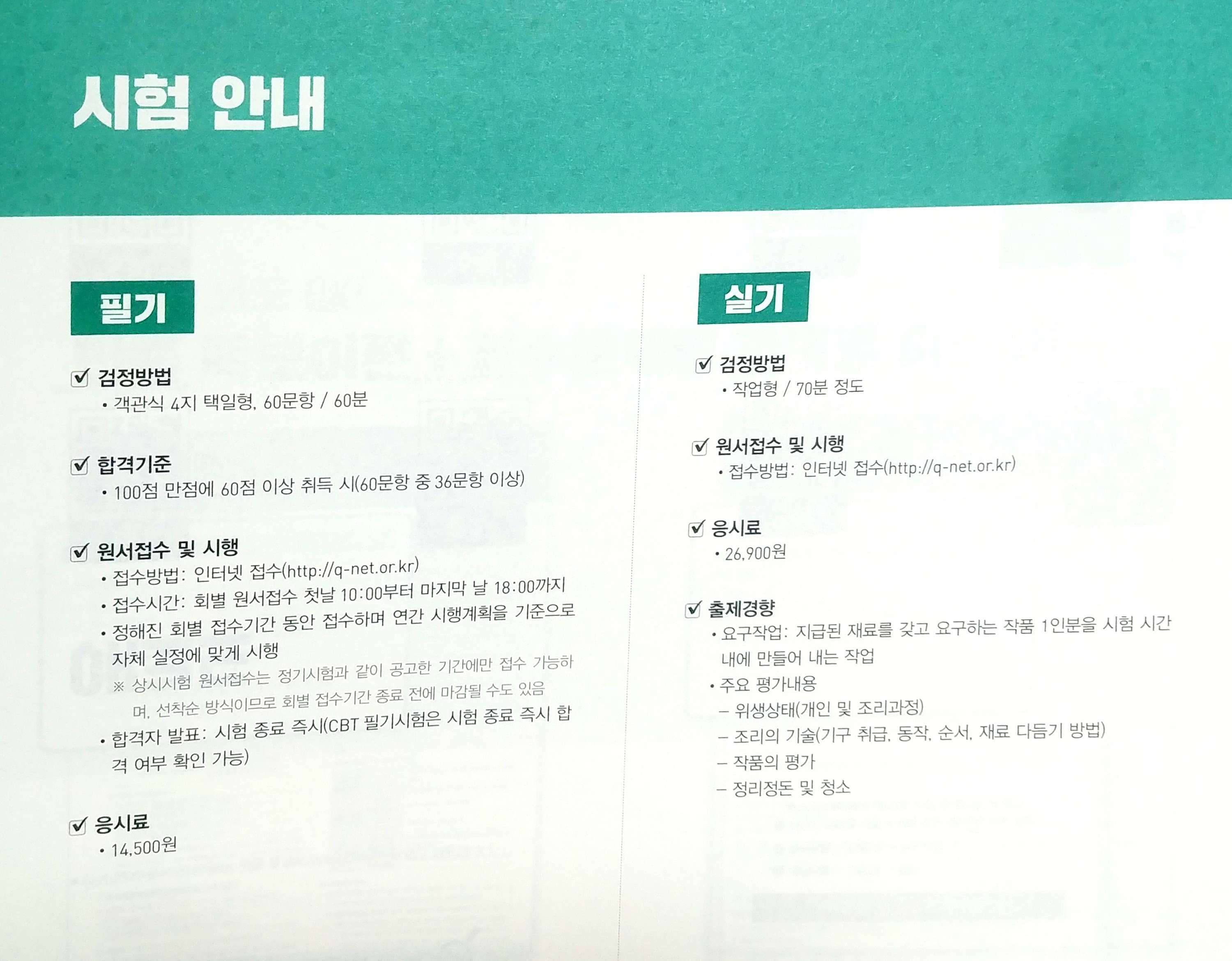 한식조리 기능사 자격증은 가장 먼저 도전하는 요리 분야 입문, 국가기술자격증이다. 시험은 객관식 4지 택일형 60문항을 60분 안에 풀어야 하는 필기와, 주어진 재료로 요리를 만들어내는 실기로 나뉜다. 실기는 20분에서 50분까지 소요되는 요리를 알려준다. 출제되는 두 과제는 실기 시험 시간 합이 60~70분이 되도록 조합하여 연습해야 한다. <필기 응시료: 14,500원 / 실기 응시료: 26,900원)
