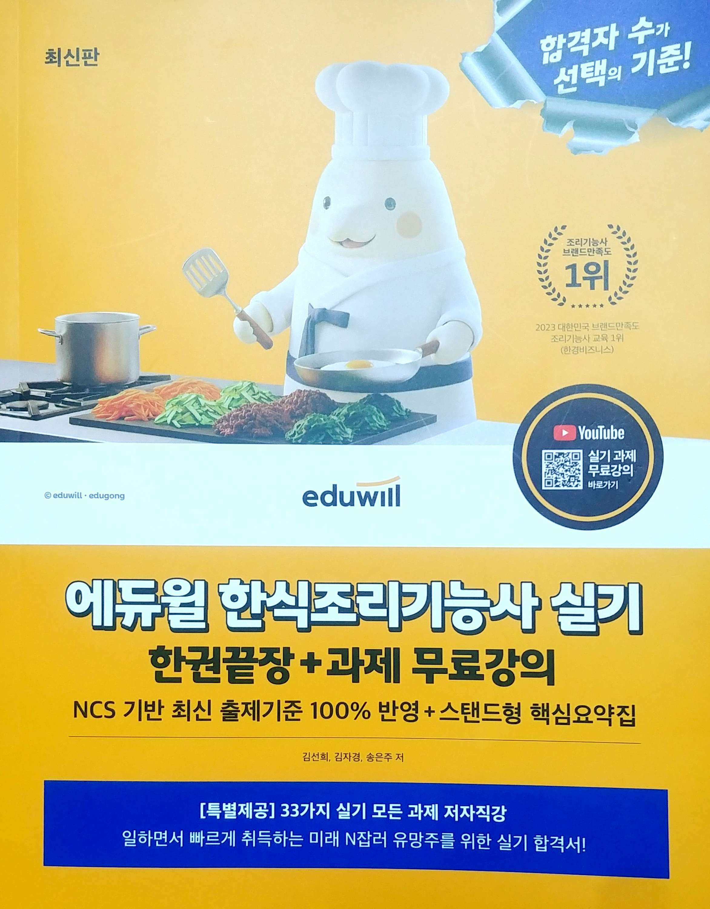 요구사항에 명시된 칼질 크기, 담음새, 조리 순서까지 전부 채점 기준에 포함된다. 문제는 이런 세부 기준들이 유튜브나 블로그에는 잘 정리되어 있지 않다는 점이다. 보다 보니 이건 책으로 따로 정리된 걸 보는 게 낫겠다는 생각이 들었다. 그래서 필기와 실기를 함께 볼 수 있는 구성의 에듀윌 교재를 선택하게 됐다.