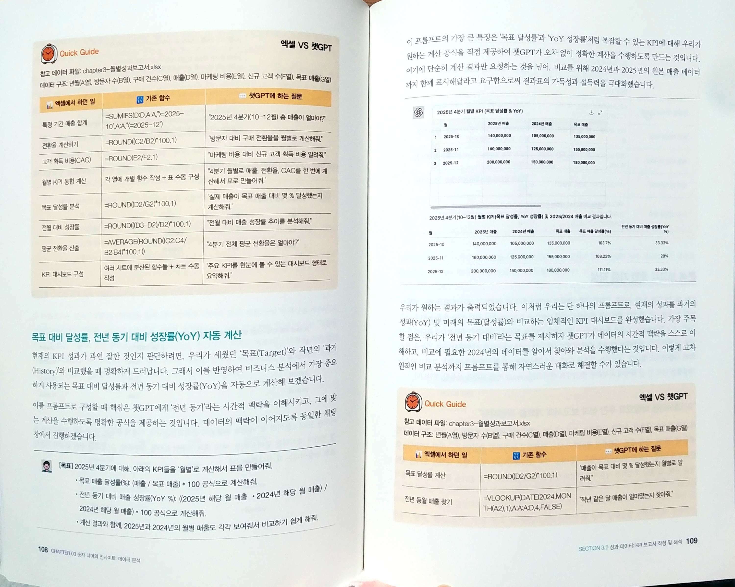 가장 먼저 해본 건 KPI 목표 달성률이랑 YoY 계산이었다. 예전 같으면 SUMIFS에 YEAR, MONTH까지 섞어 쓰면서 참조 꼬인 거 하나씩 잡아야 한다. 시간 다 가는 작업이었다. 솔직히 하다가 엑셀 꺼버린 적도 몇 번 있었던 것 같다. 근데 이번에는 "2025년 4분기 월별 KPI를 목표 달성률과 YoY 성장률로 계산해서 표로 만들어줘"라고 입력했더니, ChatGPT가 알아서 표를 만들어준다. ROUND 니 VLOOKUP 이니 이런 거 하나도 안 건드리고 말이다. 그 순간은 좀 얼떨떨했다. 이게 되네? 싶어서.