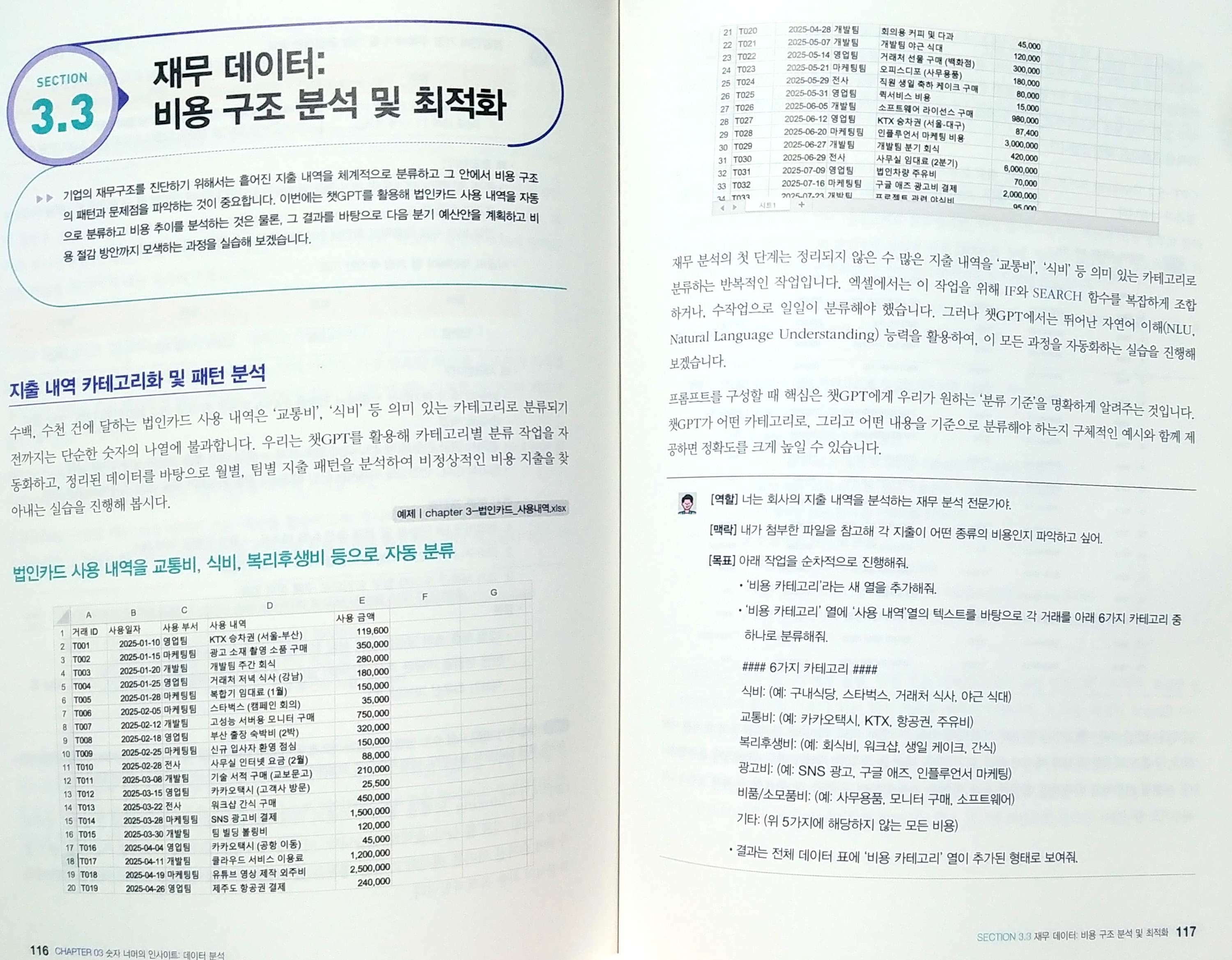 재무 데이터 비용 분류 예시는 더 와닿았다. 법인카드 내역 쌓이면 그거 분류하는 게 진짜 귀찮은데, (회사마다 자동분류 기능이 있는 프로그램을 쓰기도 하지만) 엑셀로 하려면 IF, SEARCH 계속 엮어서 돌려야 한다. 키워드 하나 빠지면 다시 고치고, 해본 사람은 알 거다. 거의 반복 작업이다. 근데 챗 GPT한테 기준을 주고 "사용 내역 보고 분류해줘"라고 하니까 <스타벅스>는 식비, <KTX>는 교통비로 나눠서 결과를 만들어줬다. 완벽하다고 하긴 좀 그렇지만, 이 정도면 충분히 쓸 수 있는 수준이었다. 이건 확실히 예전 방식으로는 좀 힘들었던 부분이다.