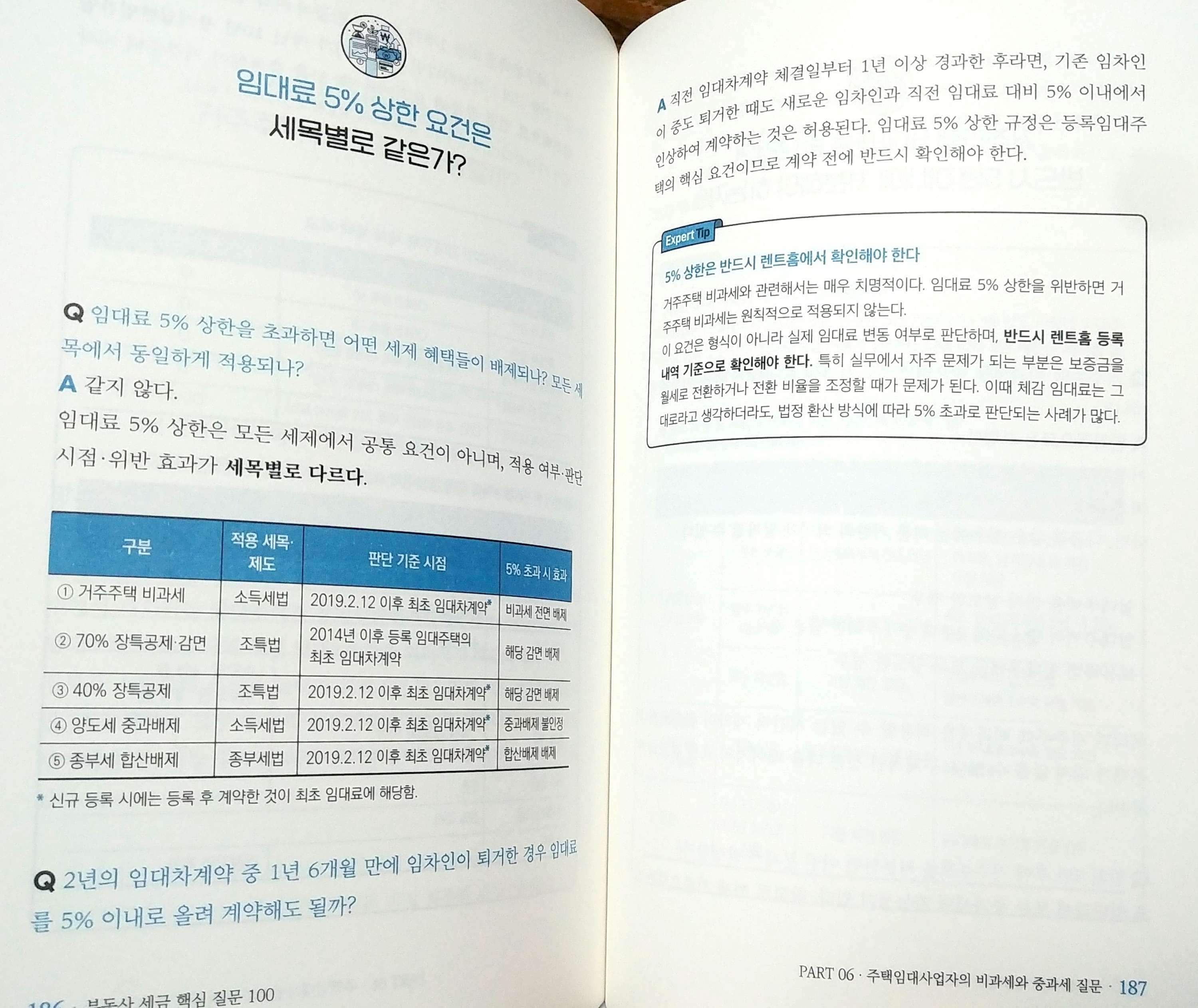 설명 방식도 꽤 실전 쪽에 가깝다. 예를 들어 임대료 5% 상한 같은 부분도 단순 규정 설명으로 끝나지 않는다. 세금마다 적용 기준이 다르고 실제로는 어떻게 판단되는지까지 짚어준다. 특히 표로 정리된 부분들이 많은데, 단순 요약이라기보다 조건을 어기면 어떤 혜택이 빠지는지 바로 보이게 되어 있다. 거주주택 비과세, 장특공제 70%, 종부세 합산배제 같은 것들이 임대료 5% 조건과 연결되어 있다는 점도 여기서 처음 제대로 이해했다. 세목마다 기준 시점이 다르다는 것도 그전에는 크게 신경 안 썼던 부분이다.