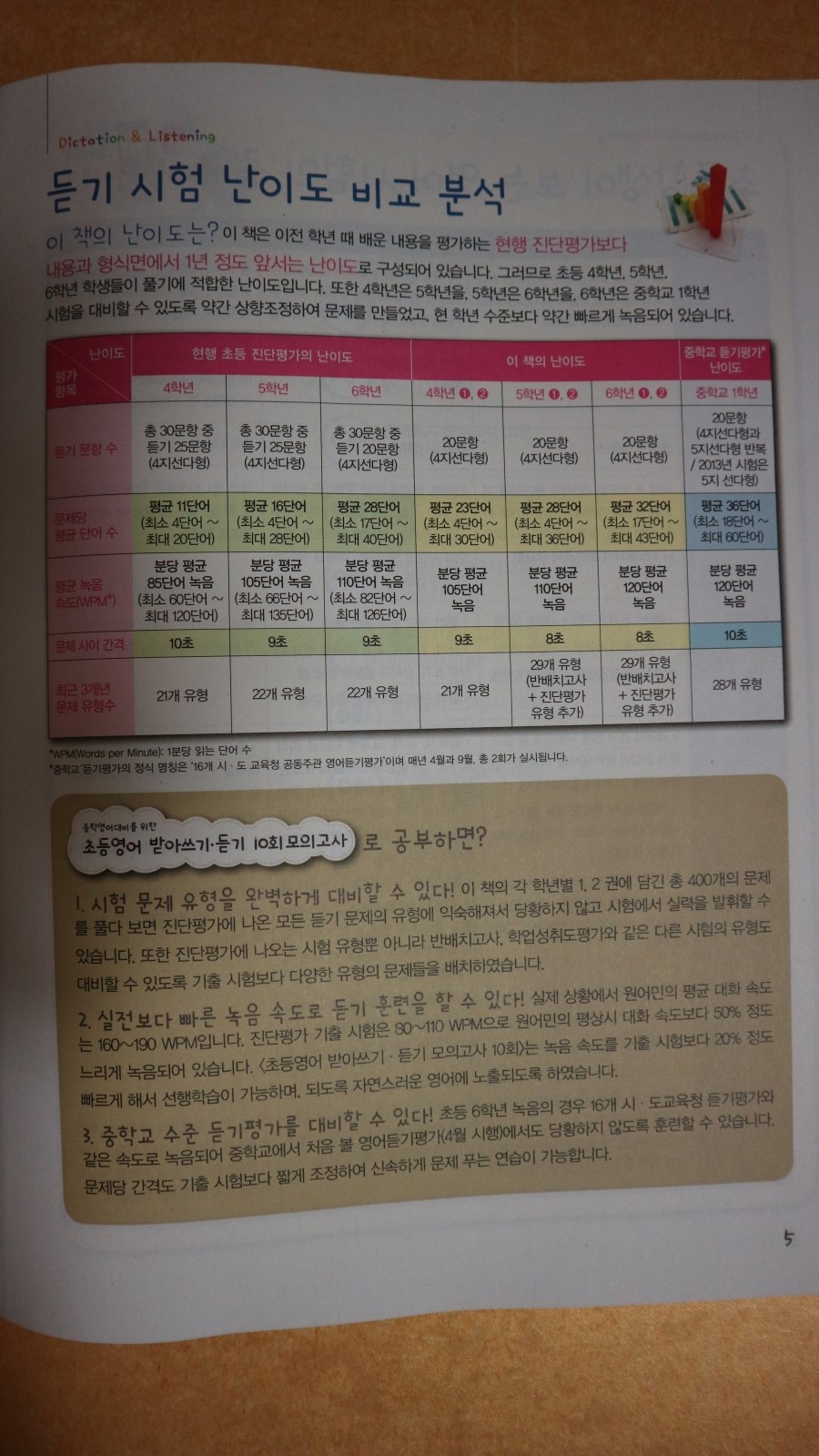 책의 안쪽에 나와 있는 현행 초등 진단평가의 난이도와 초등영어받아쓰기 책의 난이도가 표로 되어 있어서 비교하기 좋았어요..
