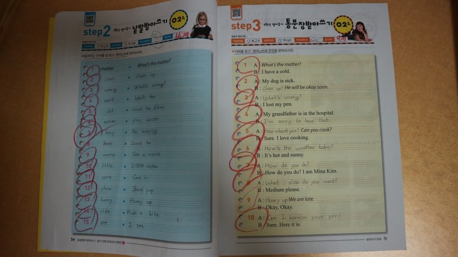 『초등영어 받아쓰기.듣기 10회 모의고사 』의 step1 에서는 그 문장들이 그대로 등장해서 2번 듣는 효과가 있어요..