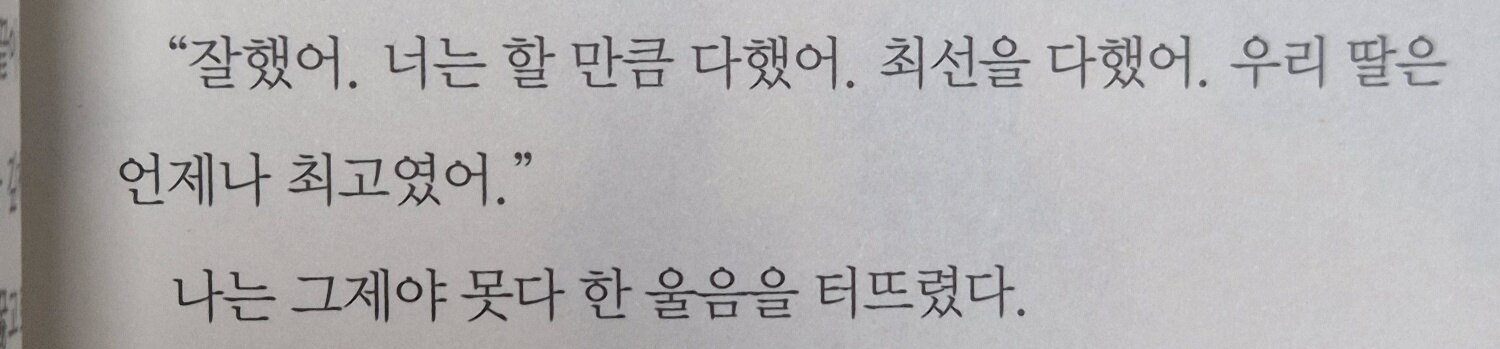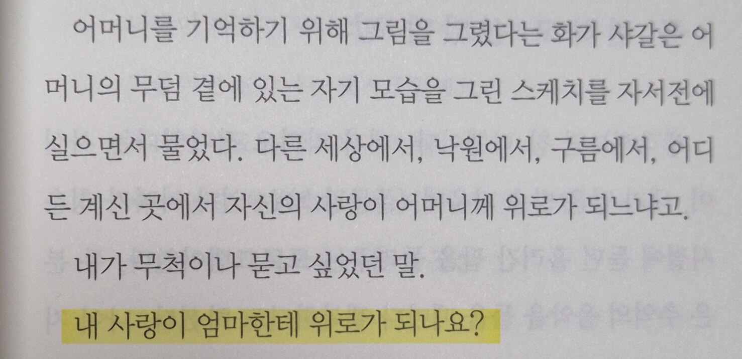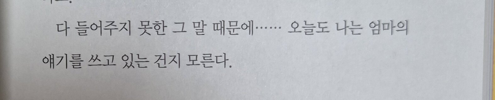 자녀도 없고 행복하게도 부모와 같은 하늘 아래서 살고 있는 나로서는, 이 이후에 내가 느끼게 될 감정은 어떤 것일지, 나중에 후회하지 않길 바라면서 읽게 되는 책이었다. 엄마가 주로 등장하시긴 하지만, 아빠도 많이 나온다. 제목 때문에 아빠 분들 너무 서운해 하시지 마시고요! 딸과 엄마 사이의 유대감은 또 다른 특별한 것이니 어쩔 수 없잖아요.(물론 나는 끝내 알 수 없을 것이다.)