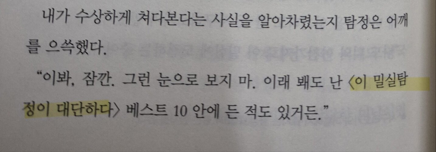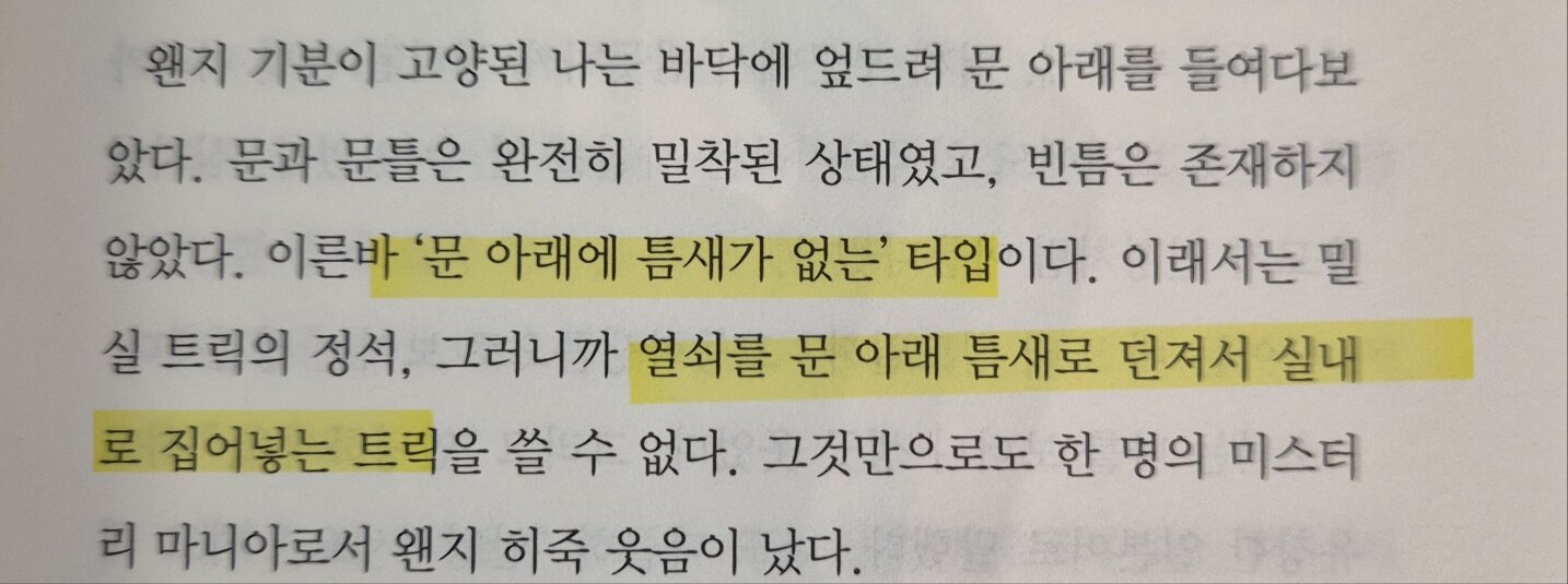 설정도 설정이지만, 발생하는 사건들이 모두 다 밀실 사건이다 보니, 밀실 사건에서 볼 수 있는 전형적인 도구들 역시도 많이 등장해, 소설 한 권을 읽는 것만으로도 '밀실 박물관'을 방문한 듯한 생각까지 든다. 논픽션으로 <아리스가와 아리스의 밀실 대도감>이 있다면, 픽션으로는 <밀실 황금시대의 살인>이 있다고 해야 하지 않을까.