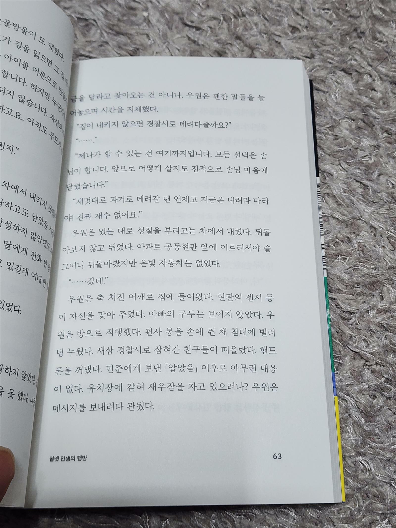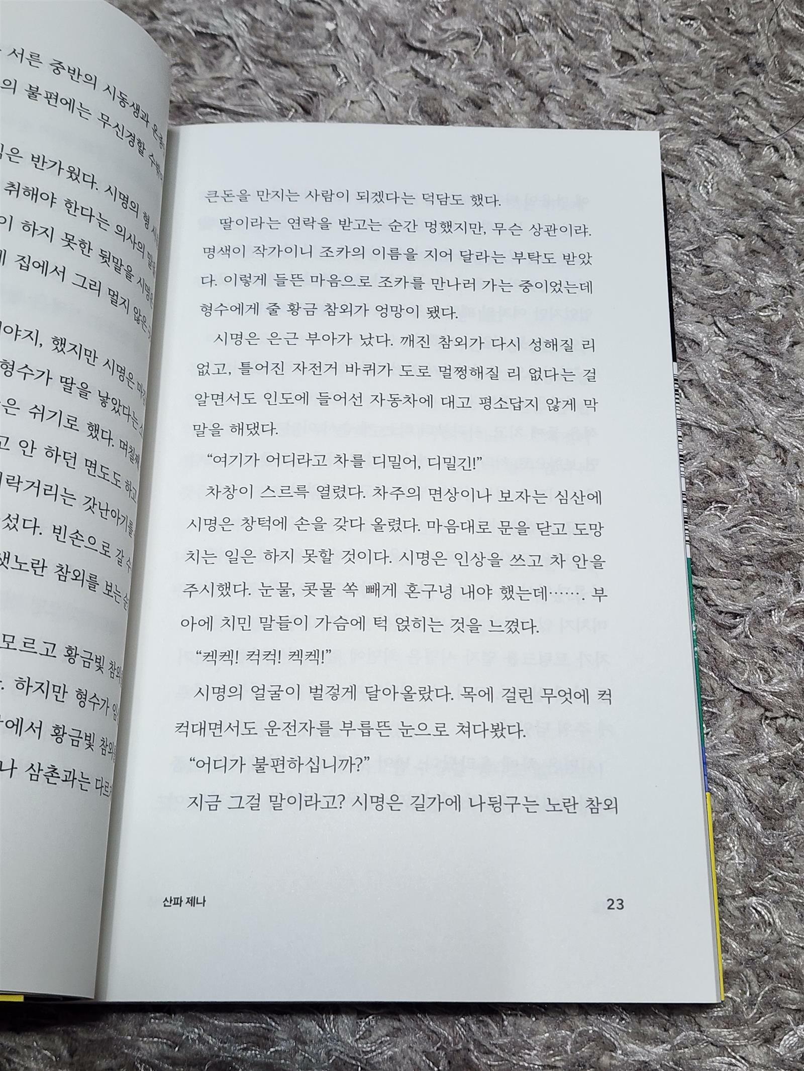 차에서 홀로 출산한 산모 덕분에 제나는 사람들의 이목에서 벗어나 있었다. 여자와 아기가 병원으로 옮겨진 후에도 뎅뎅거리는 아기의 울음소리는 여전히 제나 안에 머물러 있었다. 모체로부터 분리된 아기처럼 제나는 자신도 고덕에서 빅뱅을 통해 이곳 서울에 올게 된 것이라고 판단했다. (-19-)