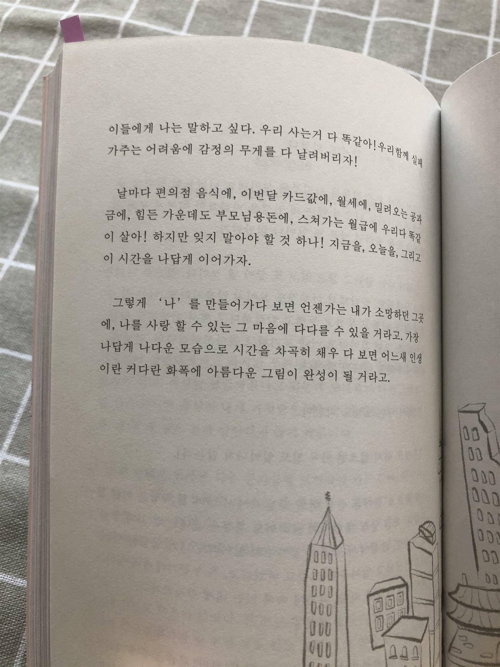 날마다 편의점 음식에, 이번달 카드값에, 월세에, 밀려오는 공과금에, 힘든 가운데도 부모님 용돈에, 스쳐가는 월급에 우리 다 똑같이 살아! 하지만 잊지 말아야 할 것 하나! 지금을, 오늘을 ,그리고 이 시간을 나답게 이어가자.