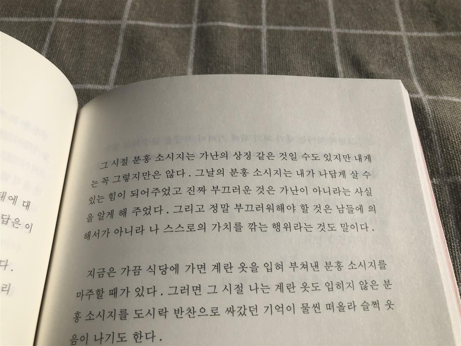 그날의 분홍 소시지는 내가 나답게 살 수 있는 힘이 되어주었고 진짜 부끄러운 것은 가난이 아니라는 사실을 알게 해주었다. 그리고 정말 부끄러워해야 할 것은 남들에 의해서가 아니라 나 스스로의 가치를 깎는 행위라는 것도 말이다.- P93