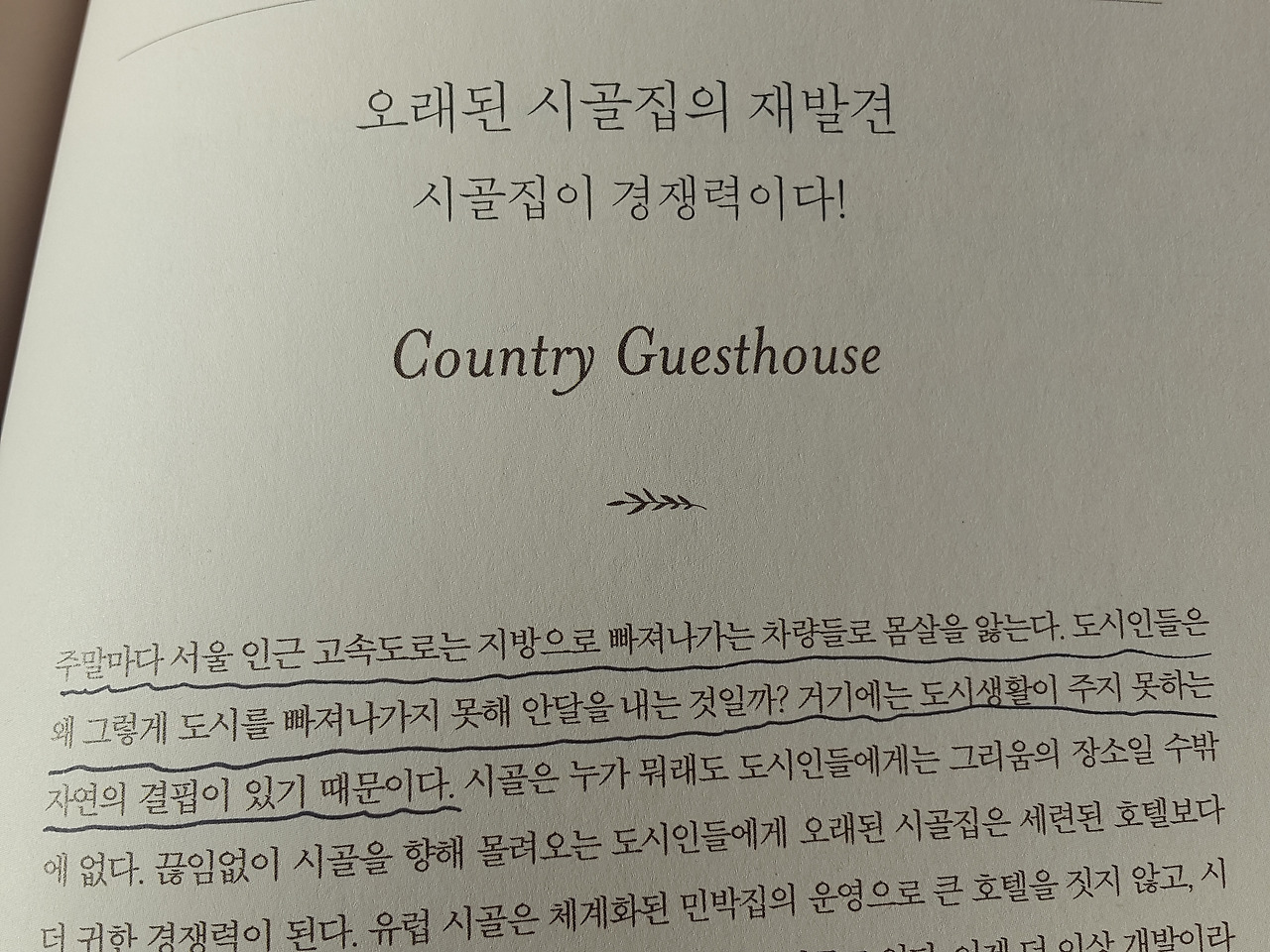 시골의 발견이라는 책은 나에게 녹색휴가였다. 당장 도심을 빠져나갈 수 없던 나에게 고급스러운 농장과 자연에 대한 글과 사진으로 휴가를 선사했고 더해서 부모님과의 어릴 적 추억이 떠오르게 해 준 은인이다. 읽고 나서 조금 아쉬웠던 점은 왜 우린 당장 산이나 들로 자유를 찾아 떠나지 못하고 책을 통해 깊게 대리 만족하게 되었을까 에 대한 고민이 남는 것이다.