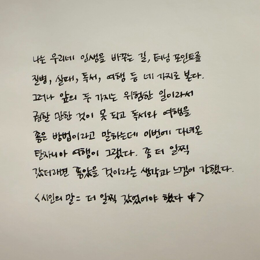 인생을 바꿀 수 있는 네 가지 터닝 포인트 중에 확실히 마음이 가는 건 시인이 권한 독서와 여행이었다. 좋은 방법이기도 하고, 질병이나 실패와는 다르게 내가 스스로 선택할 수 있는 방법이라는 게 마음에 들었다. 여행기를 읽는 건 독서와 여행이라는 두 마리 토끼를 한 번에 잡을 수 있는 가장 안전하고 확실한 방법이 아닐까 싶기도 했다.