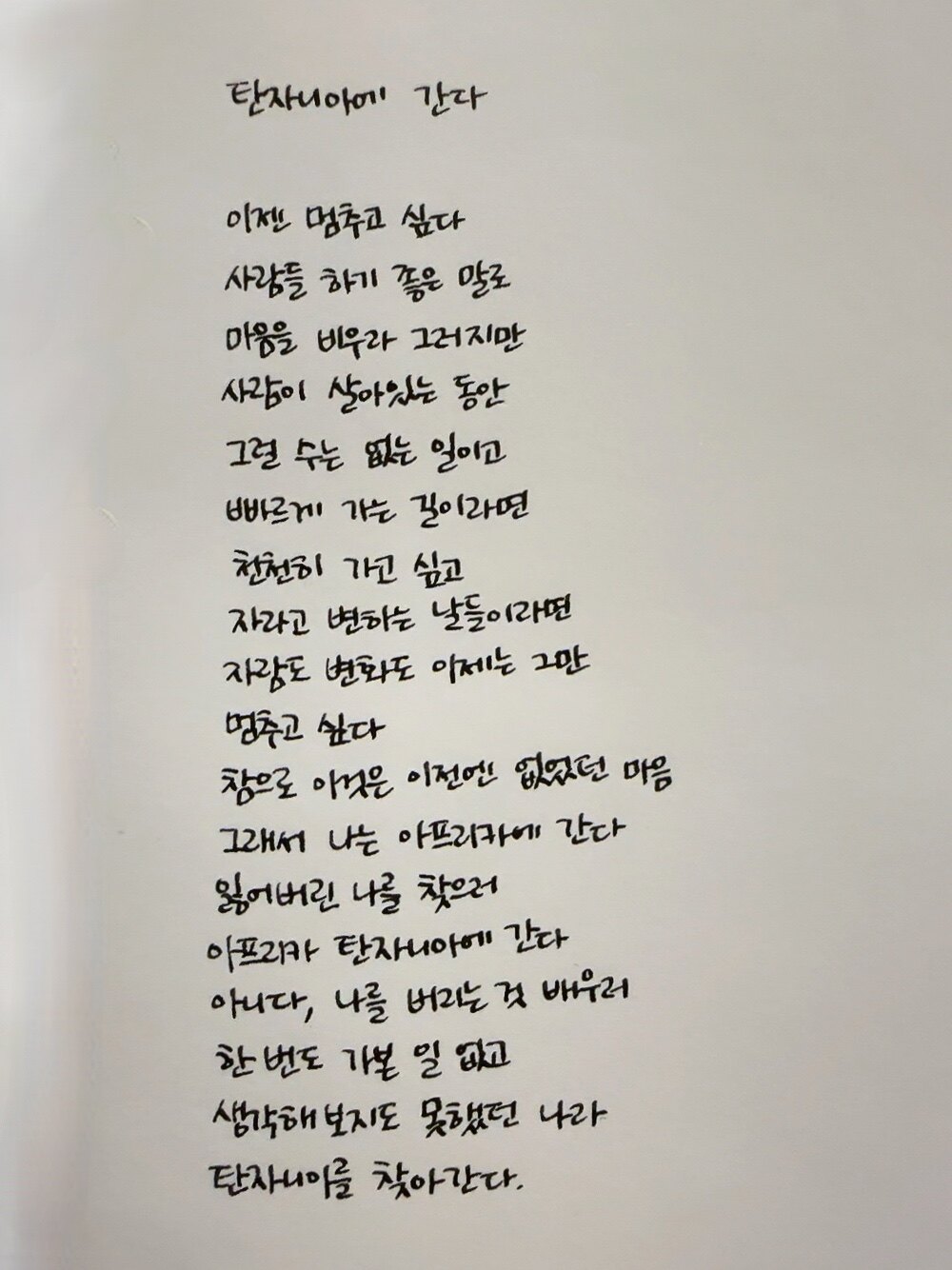 <돌아보니 그곳이 천국이었네>는 나태주 시인이 탄자니아를 여행하고 돌아와 쓴 시집이다. 나는 탄자니아에 대해 아는 것이 많지 않아서, 실제로는 표범이 살지 않는 킬리만자로와 표범이 살고 있는 세렝게티가 있다는 정도만 안다. 이렇게 낯선 탄자니아가 한 사람의 터닝 포인트가 되었다니 도대체 어떤 곳인지, 또 시인이 시로 쓴 여행기는 어떨지 궁금해하며 책을 읽기 시작했다.