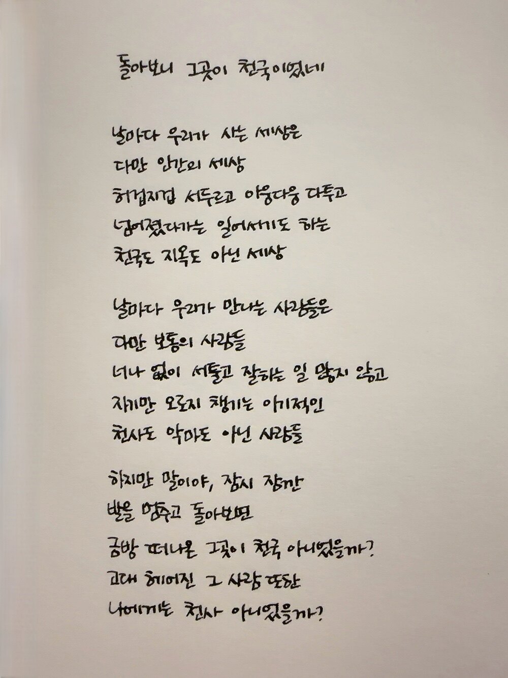 책 제목만 보고는 시인이 말하는 ‘그곳’이 어디일지 궁금했는데, 이 시를 읽으면서 ‘그곳’은 나에게도 있었다는 걸 알게 되었다. 천국도 지옥도 아닌 줄 알았는데, 돌아보니 천국이었다는 말이 마음에 오래 남았다. 돌아보기 전에, 나중이 아닌 지금 여기가 천국이라는 걸 알 수 있는 마음을 가지면 좋을텐데 쉽지가 않다.