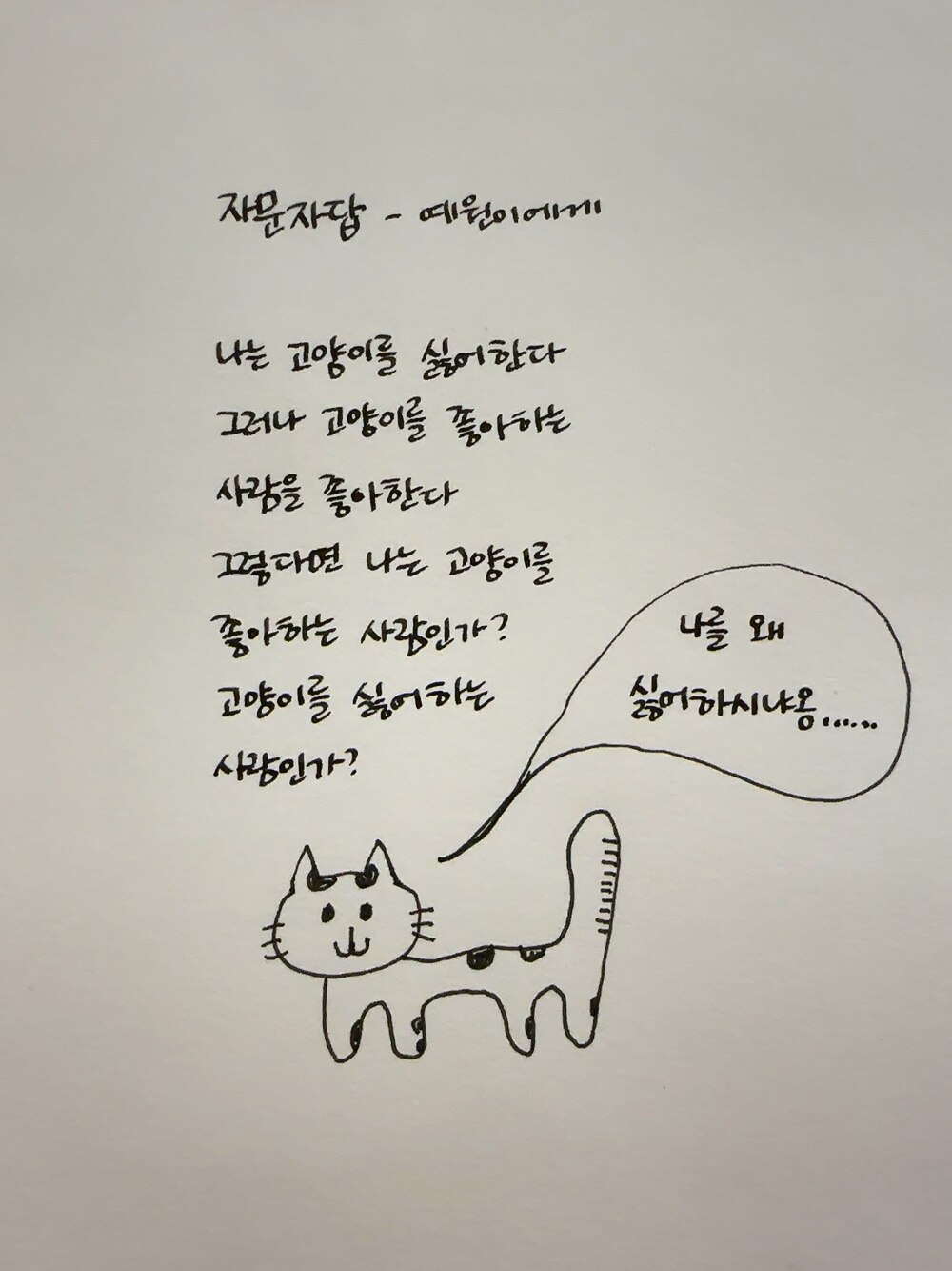 이 시를 처음 읽었을 때는 고양이를 싫어하는 사람이시잖아요... 했는데, 곰곰이 생각해보니까 아닌 것도 같다. 보통 내가 싫어하는 걸 상대가 좋아한다고 하면 ‘으... 나는 그거 싫어’로 대화가 마무리되기 쉬운데, 시인은 그 싫어하는 대상을 좋아하는 사람을 좋아한다고 하시니, 결국 나는 싫어하지만 좋아하는 사람이 좋아하는 대상을 좋아해보려는 다정한 노력이 아닌가 하는 생각이 들면서 좋아탈트 붕괴가 왔다.