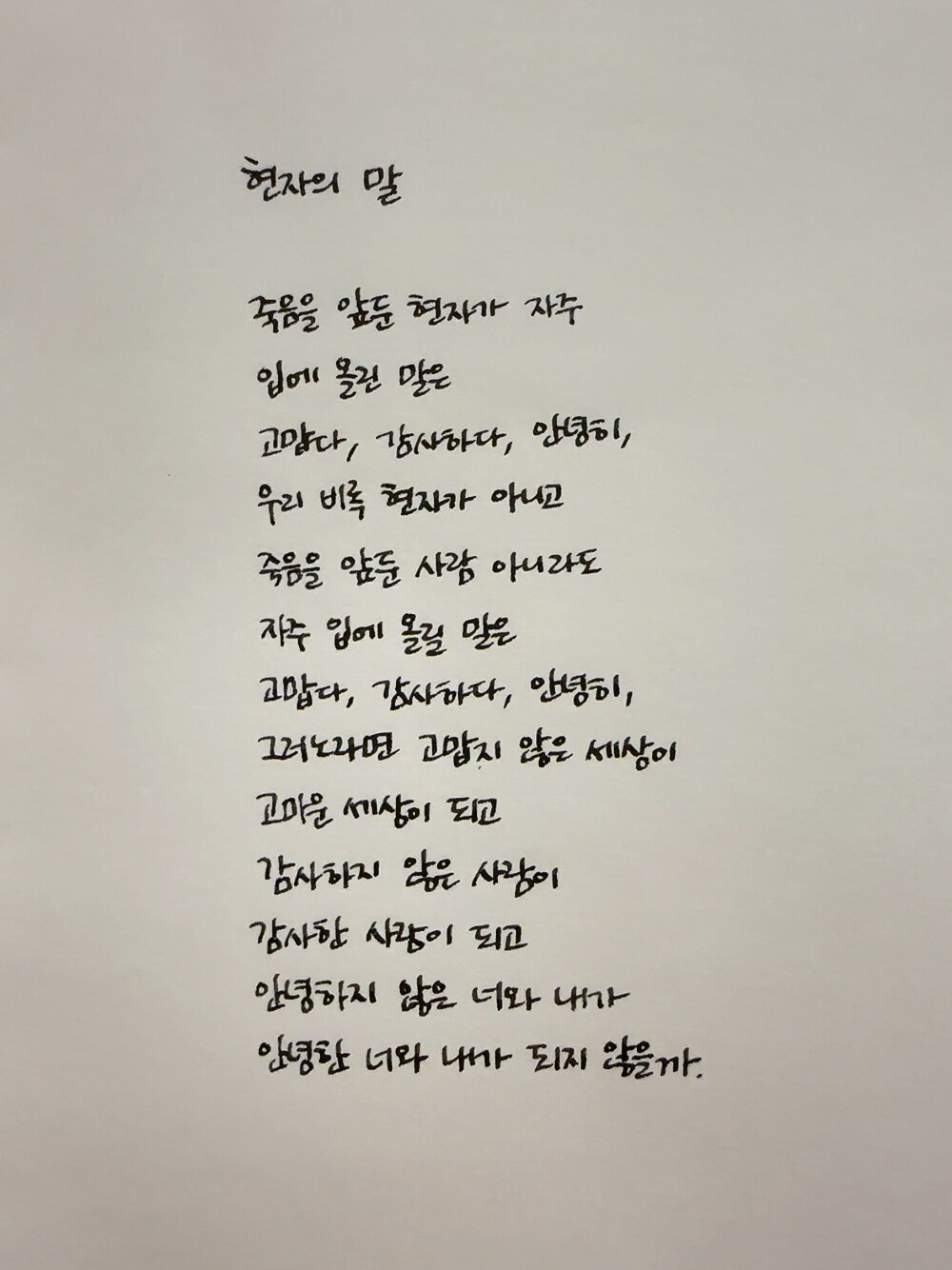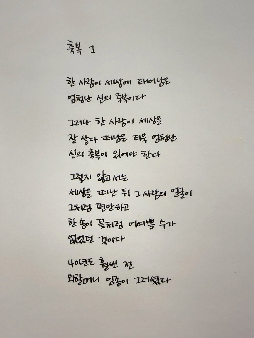 한 사람이 태어나는 것도 기적같은 일이지만, 잘 살고 잘 떠나는 것도 축복이라는 말이 붙을 정도로 어려운 일이라는 걸 새삼 생각해보게 되는 시였다.