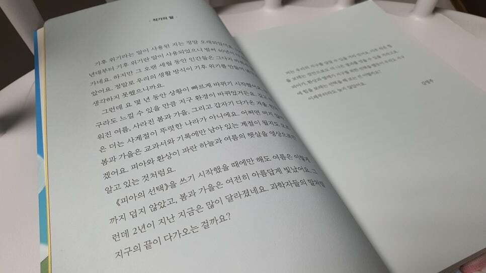 오늘 소개할 도서는 기후 위기를 실감하며 어쩌면 머지않아 봄과 가을은 교과서와 기록에만 남아 있는 계절이 될지도 모를 걱정하는 한솔수북 출판사의 「피아의 선택」입니다.